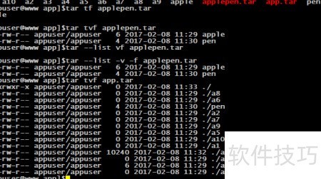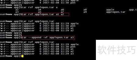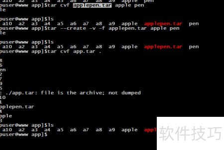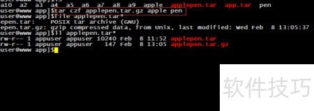 5、 将apple和pen两个文件打包为名为applepen.tar的归档文件,其中.tar为该文件的后缀名。