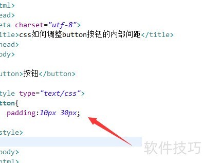 3、 在CSS中,通过padding属性为按钮设置内边距,上下为10像素,左右为30像素。