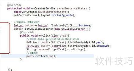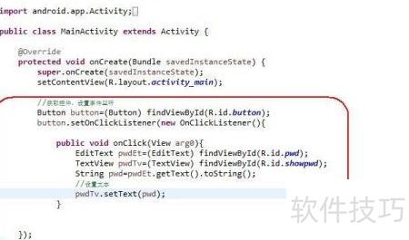 以WidgetActivity程序为例,为按钮Button设置事件监听,并新增一个TextView用于展示密码内容。当用户点击按钮时,程序会在该TextView中动态显示预设的密码信息,实现简单的交互效果。