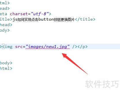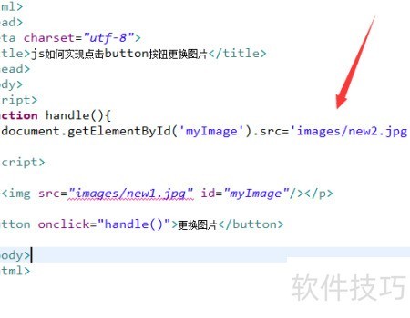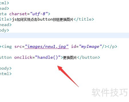 5、 在JavaScript标签中定义handle函数,通过getElementById方法根据id获取图片元素,然后将新的图片路径赋值给该元素的src属性,从而实现图片的更换效果。
