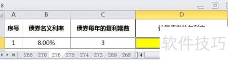 4、 在Excel中打开8.xlsx文件,选中D2单元格,在编辑栏输入公式=EFFECT(B2,C2),按下回车键,即可得出债券的年利率,结果所示。