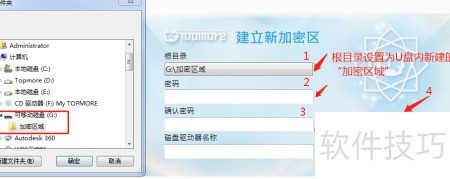 6、 选择新建的加密区域为根目录,两次输入密码后点击创建即可。