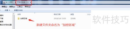 3、 在U盘中创建一个新文件夹,可自定义命名为加密区域。