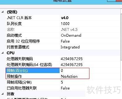 8、 限制(百分比)用于设定应用程序池中的工作进程(w3wp.exe)在指定时间间隔(默认5分钟)内可占用CPU时间的最高百分比。当实际使用超过该阈值时,系统不仅会将相关信息记录到事件日志,还会根据配置执行相应的操作,如触发回收或通知等处理机制,以防止某个应用过度消耗服务器资源,保障整体运行稳定性。