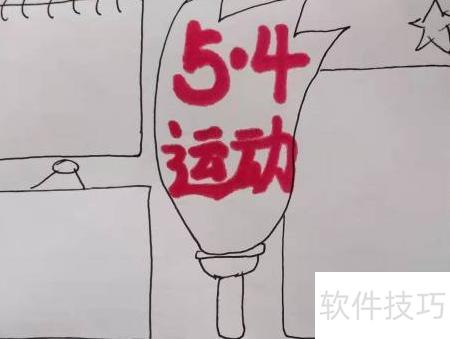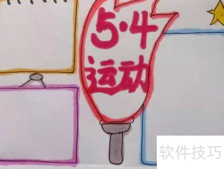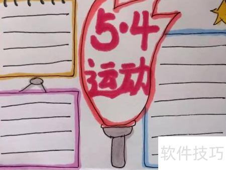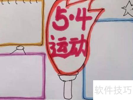 6、 在手抄报中央醒目位置书写大标题5.4 运动。