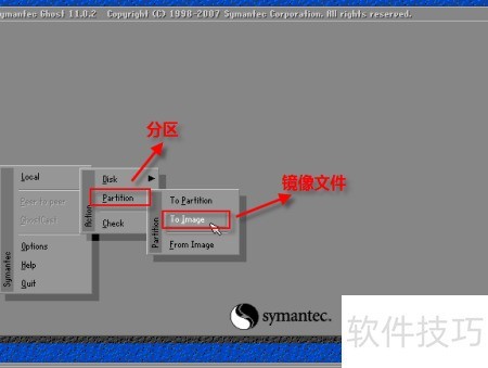 4、 使用键盘方向键选择Local下的Partition再选To Image,即进入本地模式中的分区备份功能,可将指定硬盘分区完整地制作成一个镜像文件,便于后续恢复或存档使用。