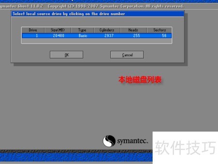 5、 按下回车键进入后,将显示本地磁盘列表。若系统中有多个磁盘,均会在此列出。使用方向键选择需备份的磁盘,再按Tab键切换至OK按钮,最后回车确认操作。