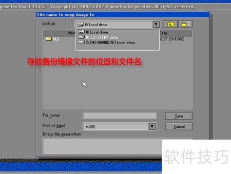 8、 此处用于设定备份镜像文件的保存路径及文件名称。默认焦点位于中间的输入框,按Shift+Tab可将焦点移至Look in后的下拉菜单,选择目标盘符。例如选择D盘后按回车确认,焦点便会自动返回中间的文件名输入框。