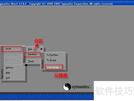 18、 启动Ghost后,依次选择本地、分区、从镜像文件,表示将镜像文件中的数据恢复到指定硬盘分区,完成系统或数据的还原操作。