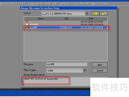 19、 此处需选择之前备份的镜像文件。与前一节操作相同,通过按键盘上的Tab键移动焦点,定位到所需镜像文件。选中后,下方描述栏将显示备份时填写的信息,确认无误后点击open即可。