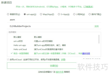 1、 启动HBuilderX,创建新项目,填写名称,选定模板后确认新建。