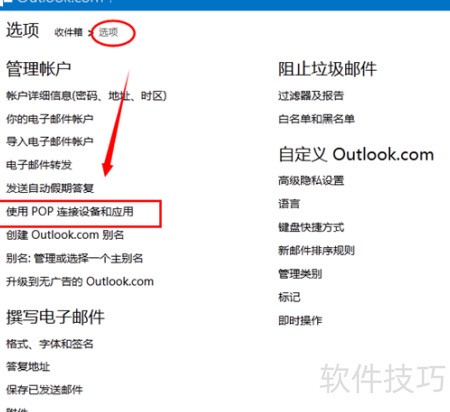 2、 请按图示前往Outlook选项页面,启用POP账号功能。新申请的Hotmail邮箱默认未开启此功能,需手动设置后方可使用。