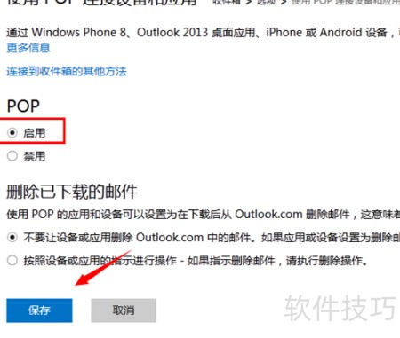 7、 进入POP设置页面,开启并启用POP功能,保存设置时注意选择保留服务器副本,以防邮件被误删,确保邮件安全备份。