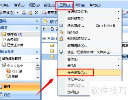 9、 设置完成后,返回Outlook客户端,依次点击工具和账号设置菜单,操作所示。