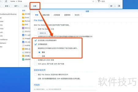 2、 在中开启浏览器间拖拽传输功能后,可同时登录两个浏览器访问DSM,直接在File Station之间拖动文件。此外,还可设定智能拖拽时冲突文件的处理方式,选择或目标文件,提升操作灵活性与效率,满足不同场景下的文件管理需求。