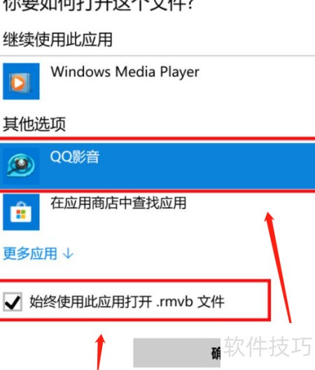 4、 选择QQ影音并勾选始终用此程序打开rmvb文件即可完成设置。