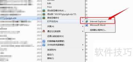 4、 打开.mht文件时,系统通常会自动推荐程序,由于该文件需用IE浏览器打开,因此应选择IE浏览器进行操作。
