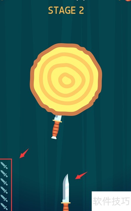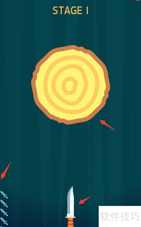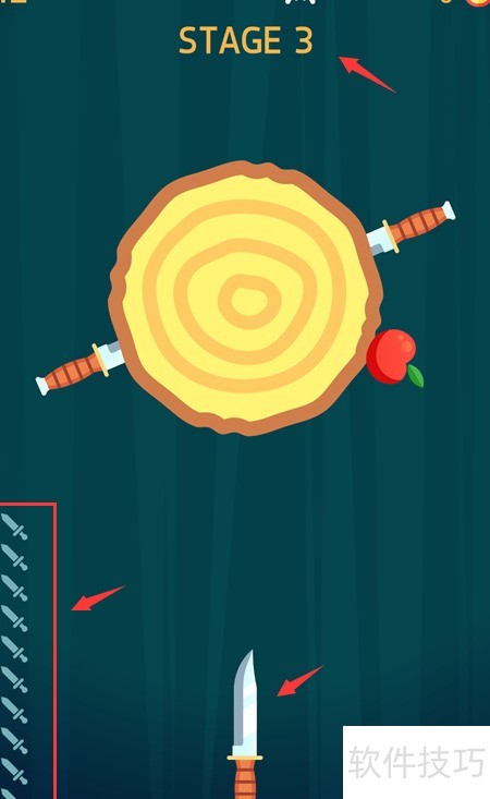 7、 进入第三关,需将十把飞刀全部投中旋转靶面。从本关起,靶盘转速不再均匀,忽快忽慢,挑战难度显著提升,具体所示。