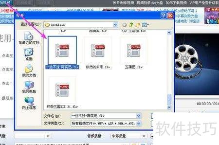 2、 点击视频添加按钮后,系统将弹出文件选择窗口。在该窗口中找到已下载的FLV文件,选中并点击打开,即可将所需转换的FLV文件导入转换工具,具体操作所示。
