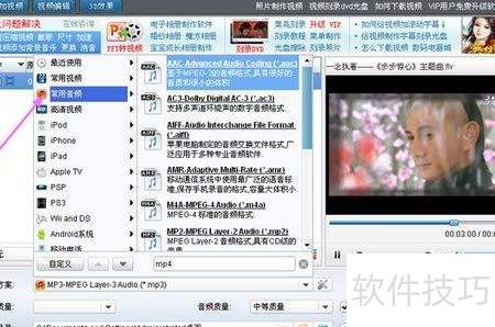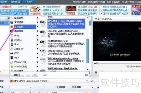 4、 可一边预览一边选择格式,点击主界面底部预置方案右侧的按钮,在弹出的格式选项中选择常用音频类别,具体操作所示。