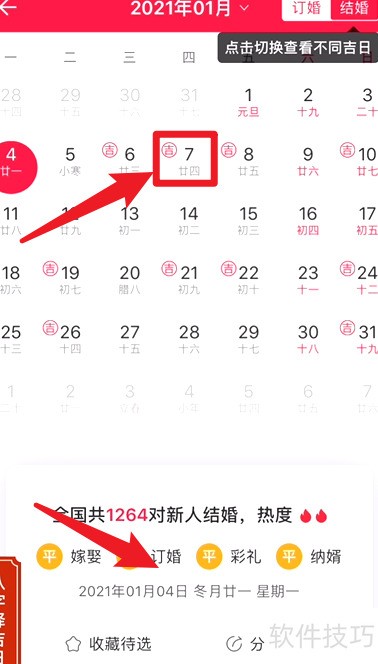 4、 挑选日期时,点击左上角带吉字标记的选项查看详情即可。