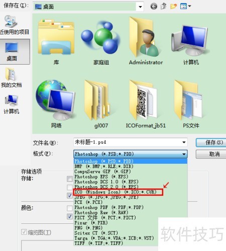 5、 重启PS后,点击保存,格式选项中即可看到新增的ICO格式,所示。