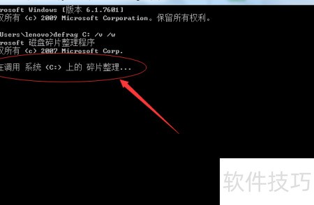 3、 输入defrag C: /v /w后按回车,屏幕上会显示正在调用系统(C:)上的碎片整理……,表示磁盘碎片整理开始运行。