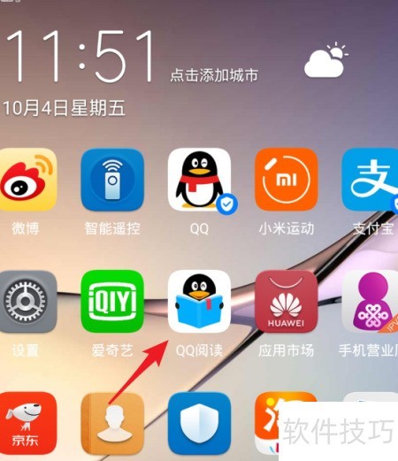 1、 解锁手机后进入系统,启动QQ阅读应用。