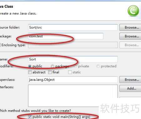 2、 创建Sort类,配置报名信息,并勾选自动生成main函数选项。
