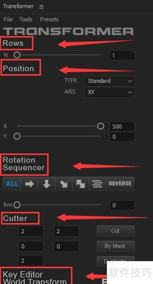 2、 在Windows窗口菜单中选择Transformer并打开其操作界面,即可看到多个功能模块。主要包括:控制数据排列的Row行选项、调整对象位置的Position位置工具、实现角度变化的Rotation旋转设置、管理动画顺序的Sequencer序列功能、进行区域裁剪的Cutter裁切工具、编辑关键帧的Key Editor模块,以及用于全局坐标调整的World Transform世界坐标变换功能。这些选项为三维空间中的对象变换提供了全面的操作支持,适用于复杂的场景编辑与动画制作需求。