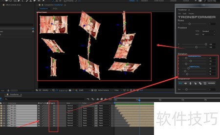 4、 全选所需图层后,在Rows中设定行数,于Position位置处调整XY方向的间距,图层便会自动整齐排列。