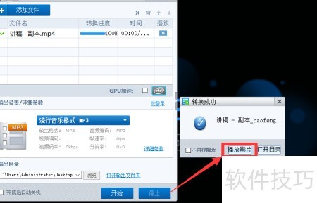 2、 通过暴风影音的转码工具,可实现背景音乐的转换或提取。操作时只需将输出格式选择为音频格式即可完成设置。