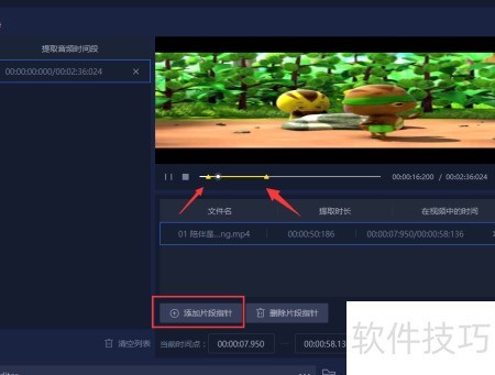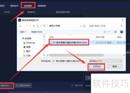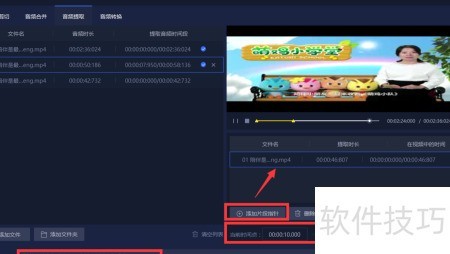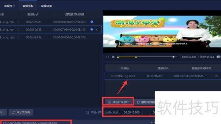 5、 切换至音频提取选项卡,点击添加文件选择视频,随后在右侧点击音频片段提取按钮进行相关设置即可。