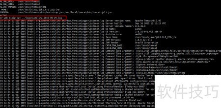 19、 返回到 Tomcat 的 bin 目录后,执行rm -f ../logs/*命令清除日志文件,随后运行./startup.sh启动服务。启动完成后,查看 catalina 日志信息,可见之前出现的错误已成功消除,系统恢复正常运行状态,具体结果所示。