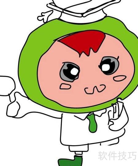 6、 用绿色涂满小博士的鞋子,帽子则以灰黑色和橙色组合填充,完成简笔画创作。