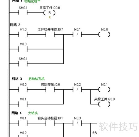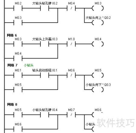 14、 当I0.2与I0.4同时按下并闭合时,钻头开始同步向下钻孔,此时Q0.2和Q0.4被触发启动。