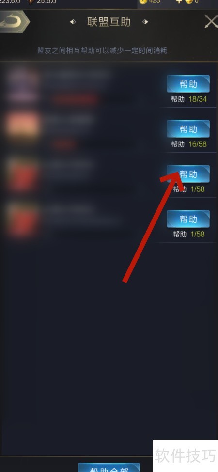 3、 进入联盟互助页面,查看成员求助信息后点击按钮即可参与援助。