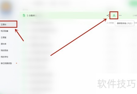 3、 在左侧点击,找到所需课件后,点击右侧的按钮,即可将文件保存至本地设备。