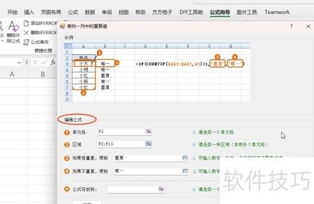 5、 在弹出的对话框中输入操作公式,首先选定目标单元格,接着选取用于查找的区域范围,本例中选择的单元格为F2,查找区域为F2至F13。