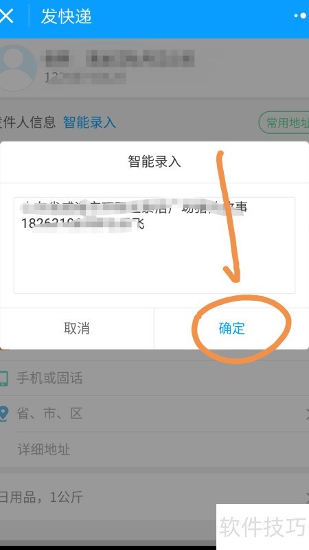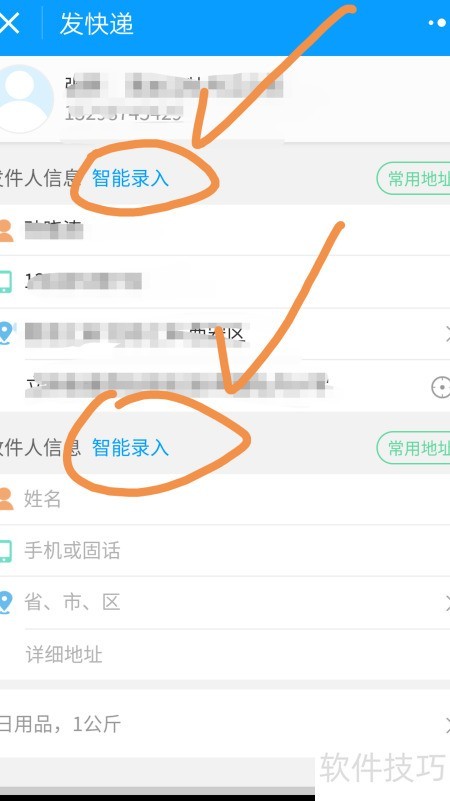 5、 扫描后进入寄件页面,智能录入功能可自动将复制的收件人姓名、电话和地址填入对应栏位。
