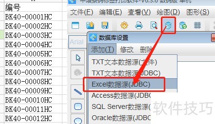 2、 新建标签后,在中琅条码标签打印软件中进入数据库设置,选择添加Excel数据源,将表格中的线缆编号导入系统。该软件兼容多种常见数据库格式,包括Excel、TXT、Access、CSV,以及MySQL和SQLServer等主流数据库,便于用户灵活连接和调用各类数据,实现高效、准确的标签批量打印,满足不同场景下的数据管理与打印需求。