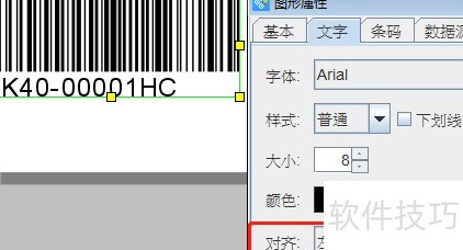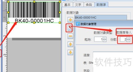 3、 使用中琅条码标签打印软件,通过绘制一维码功能在电缆标签上添加条形码。进入条形码的图形属性中的数据源设置,将数据对象类型设为数据库导入,连接此前导入的Excel数据源,份数设为2,保存设置。同时可调整条码数据的显示位置为左对齐,确保信息清晰准确呈现于标签之上。