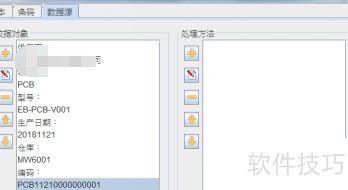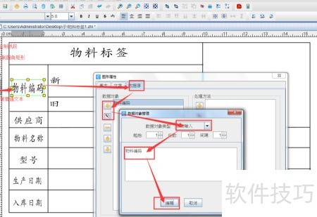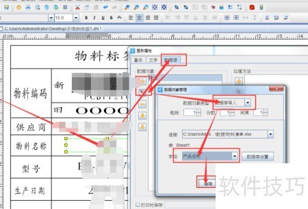 3、 接下来需导入物料信息。首先,在条码标签打印软件左侧工具栏中点击绘制普通文本按钮,在物料名称对应位置添加文本内容。随后打开图形属性面板,进入数据源选项并点击更改,在弹出的数据对象管理窗口中,将数据对象类型设置为数据库导入,并在字段下拉菜单中选择名称项。其余如规格、批次等信息也依此方式操作,分别匹配对应的数据库字段。对于标签上的条形码部分,切换至工具栏中的绘制一维条码功能,插入条码图形后,同样进入其图形属性界面,点击数据源下的更改按钮,在数据对象管理窗口中选择数据库导入类型,并关联物料编码对应的字段。通过上述步骤,实现标签各元素与数据库信息的准确绑定,确保打印时能自动读取相应物料数据。