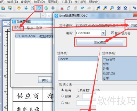 1、 今天以物料标签为例,演示批量制作商品标签的流程。先将物料信息录入Excel表格,再将其导入条码标签打印软件。进入数据库设置,依次点击添加Excel数据源(JDBC),通过浏览选择文件,完成测试连接后进行编辑,即可调用数据批量生成标签。