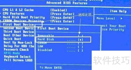 3、 进入Advanced BIOS Features界面后,通过方向键选中Hard Disk Boot Priority选项,按回车键确认并进入该项设置。具体操作所示,请根据提示完成后续步骤。