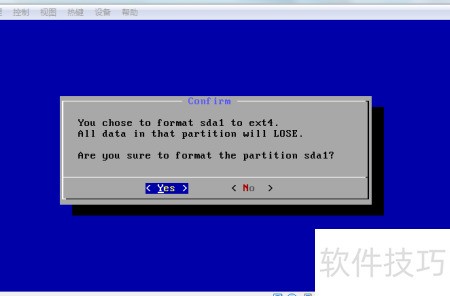 23、 消息提示是否格式化sda1分区,用左右箭头选择是后按回车确认。