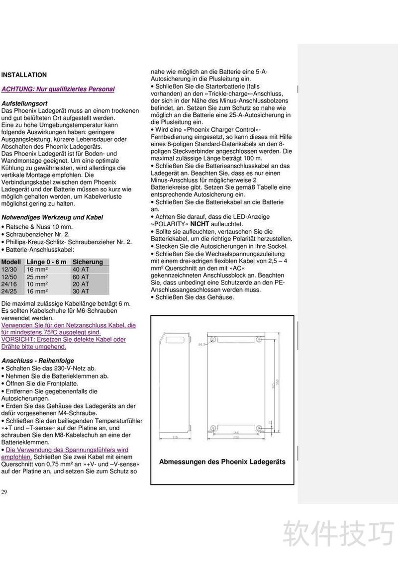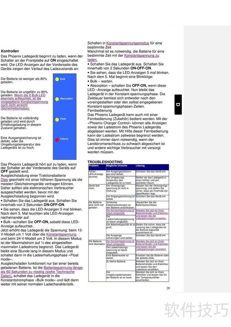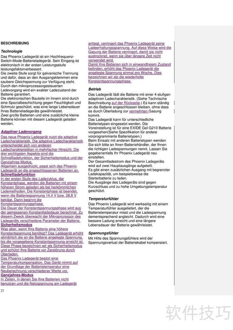 、 Phoenix 12/24V充电器说明书详细说明了产品操作步骤与日常使用中的故障排查方法,帮助用户正确、安全地使用充电设备。