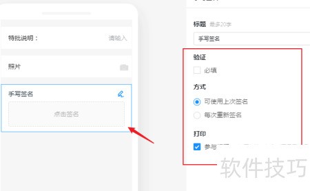 4、 选择签名控件,根据需求在属性窗口设置必填验证及相应选项。