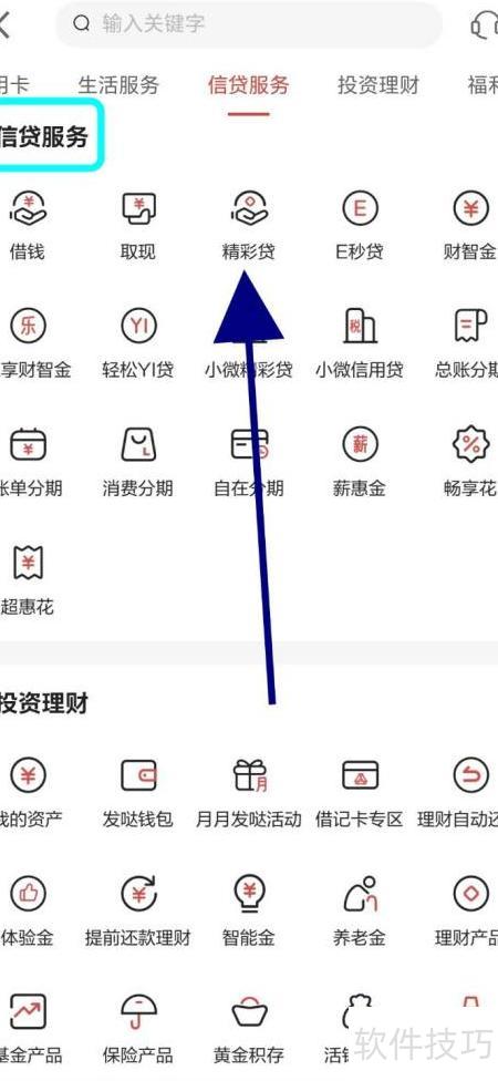 3、 在更多服务页面的信贷服务里,选择精彩贷即可查看详情。