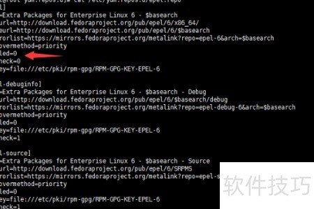 2、 修改epel.repo文件,定位箭头所指处进行编辑操作。